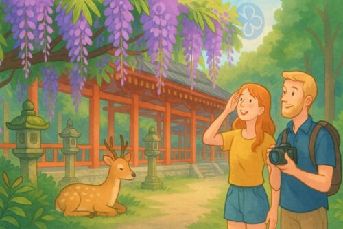 As evening approaches, head to Kasuga Taisha Shrine, where vermilion halls and lantern-lined paths glow softly in the fading light.